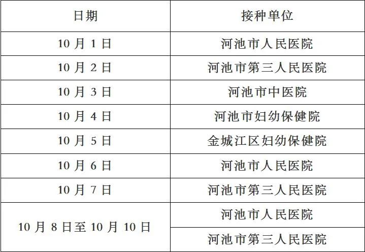 根据河池市金城江区新冠病毒疫苗接种工作专班安排,2022年10月1日至10月10日新冠疫苗接种安排如下,请各位民众根据需求选择新冠疫苗接种点接种。
