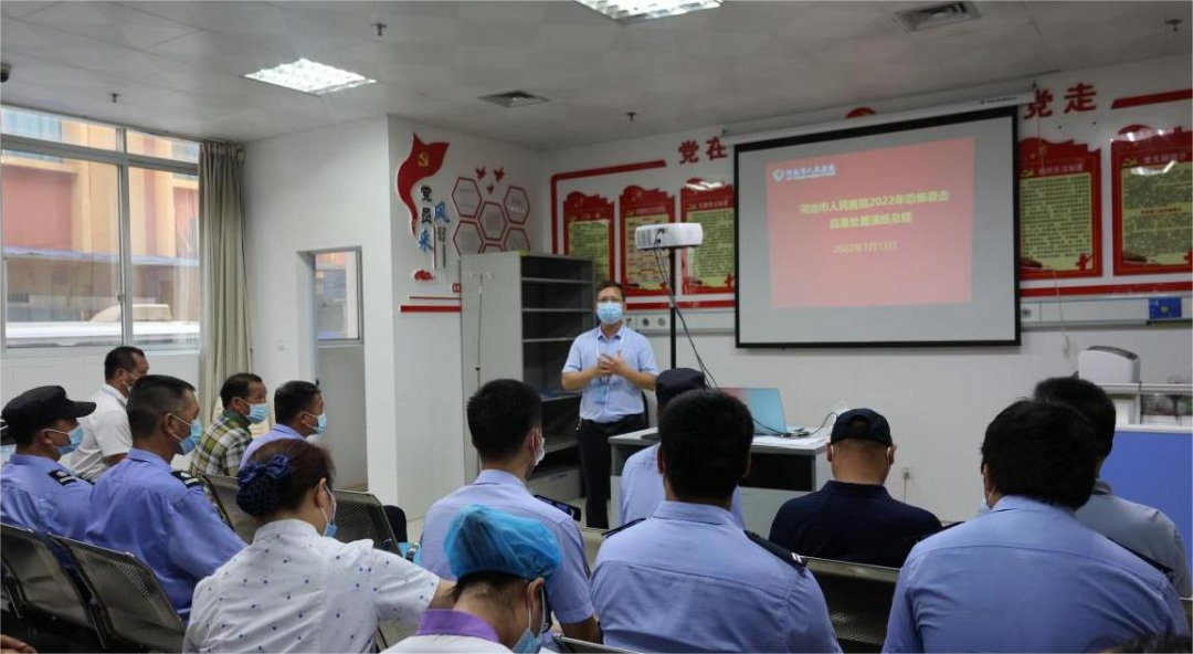 最后,黄明棣副院长作演练总结,他表示,此次演练过程行动迅速,各部门配合默契,检验了医院对暴力伤医事件的应急处置能力,提升了医院安全防范能力,保障医务人员的生命安全,维护医院的就诊秩序。
