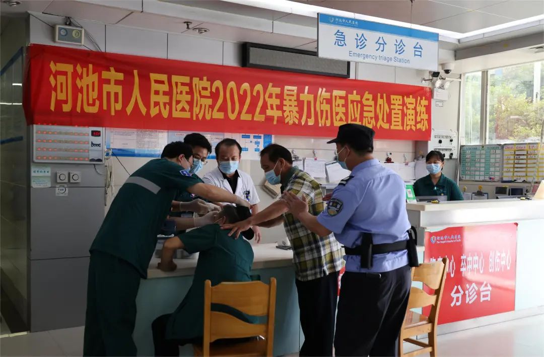 为进一步维护医院医疗安全,营造和谐就医环境,增强医院员工防卫意识,7月13日,河池市人民医院联合金城江区公安分局南桥派出所开展防暴力伤医应急处置演练。