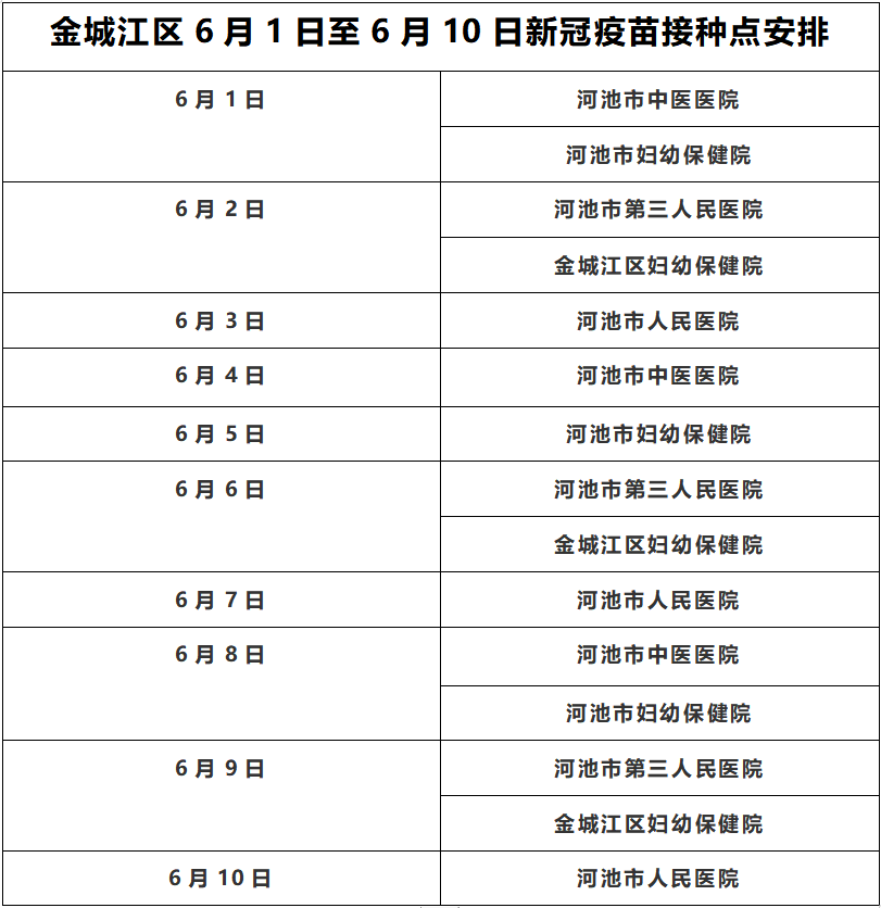 根据河池市金城江区新冠病毒疫苗接种工作专班安排,2022年6月1日至6月10日新冠疫苗接种安排如下,请各位民众根据需求选择新冠疫苗接种点接种。