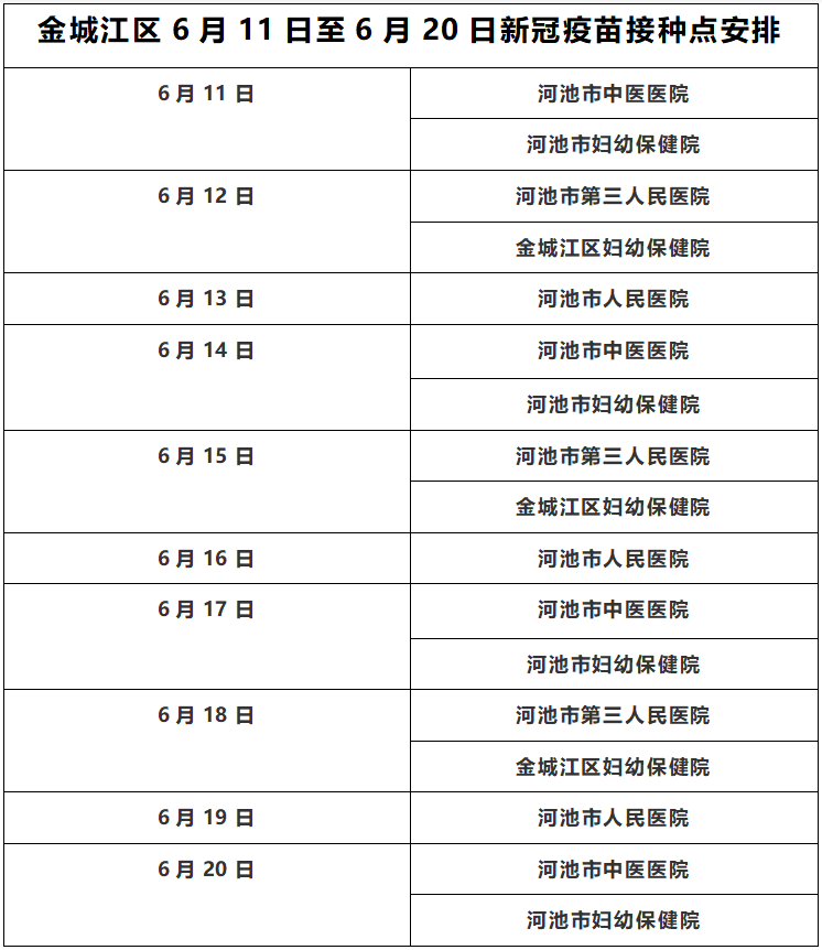 根据河池市金城江区新冠病毒疫苗接种工作专班安排,2022年6月11日至6月20日新冠疫苗接种安排如下,请各位民众根据需求选择新冠疫苗接种点接种。