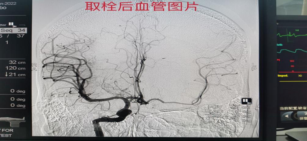 随后,立即将患者转入神经重症监护室,并在介入导管室行急诊颅内动脉取栓手术。经过全体医护人员的全力配合,短短1小时内便顺利取出血栓,予复查造影,闭塞的血管通了,手术成功!