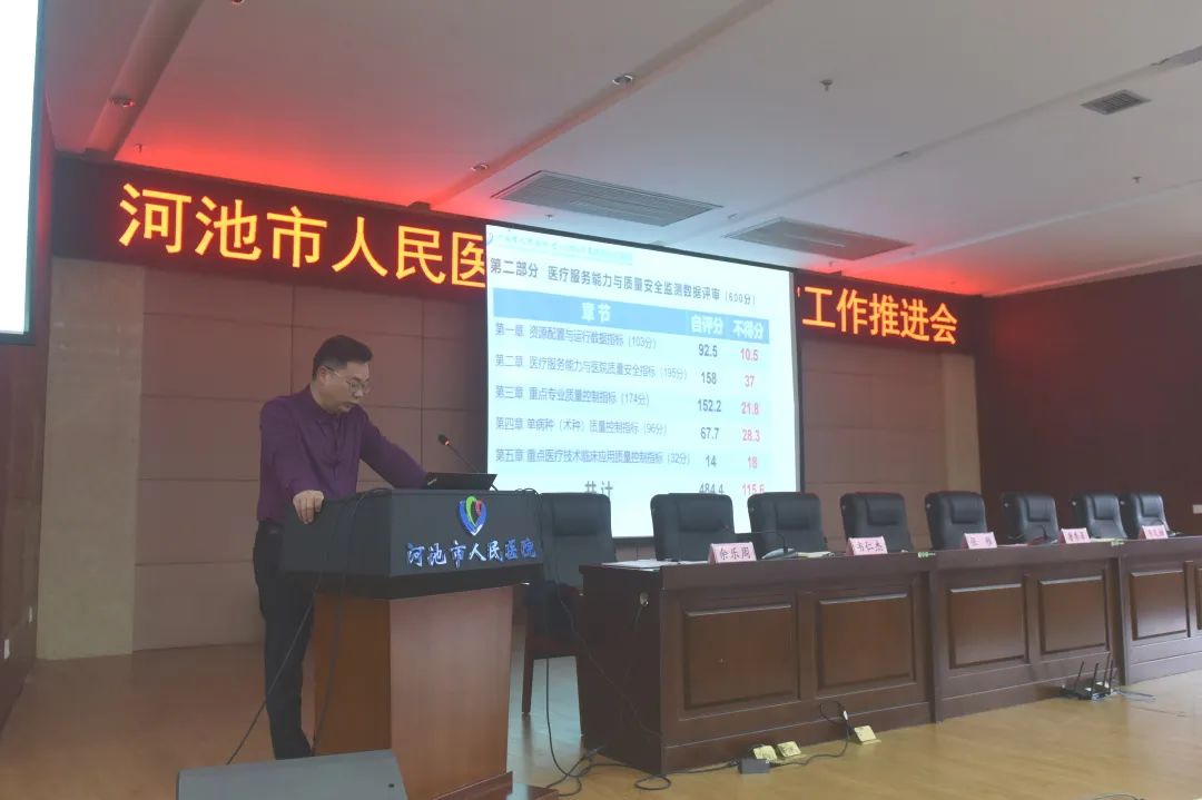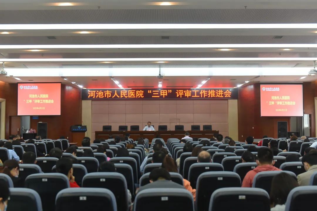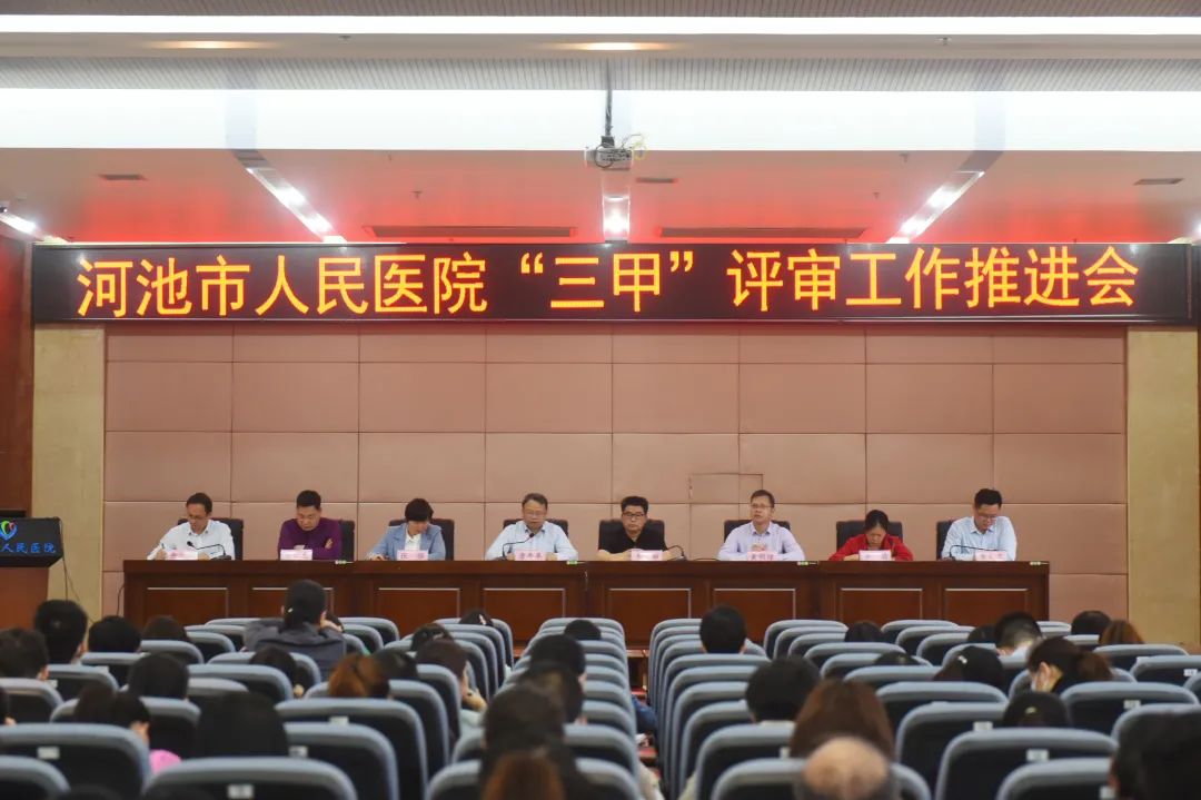 为高效推进三级综合医院评审工作,4月21日下午,河池市人民医院召开工作推进会,就三甲评审工作进行再部署。院领导班子、全院中层、各科室职工代表及职能科室全体人员参加会议。会议由余乐周副院长主持。
