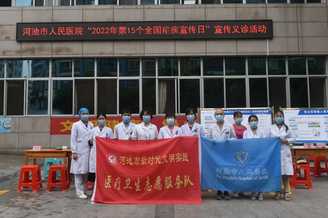 2022年4月26日上午,河池市人民医院组织医护人员在门诊综合楼前开展“疟疾输入再传播,共创无疟世界”“一切为了劳动者健康”的宣传义诊活动。