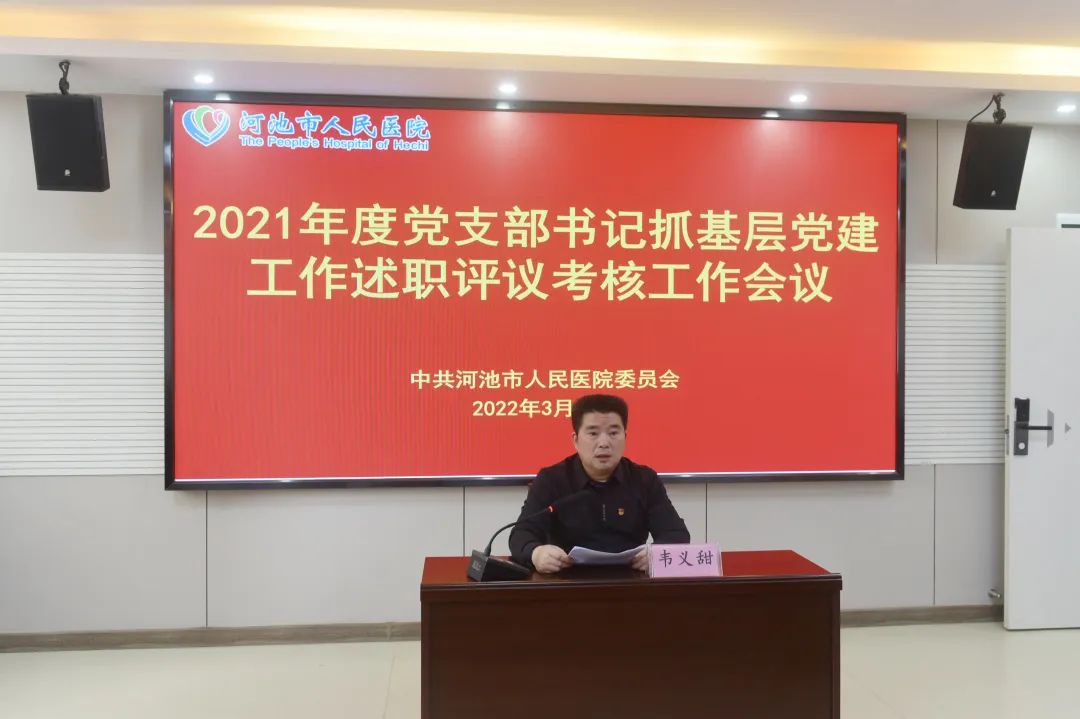 3月25日下午,河池市人民医院召开2021年度党支部书记抓基层党建述职评议考核、推动落实党风廉政建设主体责任述责述廉工作会议。医院领导班子、党委委员、纪委委员、党支部委员、基层党员或群众代表、“两代表一委员”等参加会议,院党委书记韦义甜主持会议。