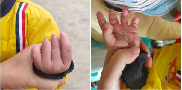 术后第3天,患儿再植指体色泽变暗紫,手指淤血肿胀、水泡、指腹张力明显增高,医生判断是发生了静脉危象,立即给予侧切口放血减压及抗痉挛药物治疗。由于观察和处置的及时,淤紫的手指逐渐恢复红润,患指转危为安。经过创伤手外科医护团队精心照护,9天后球球离断的中环指再植成功并顺利出院。