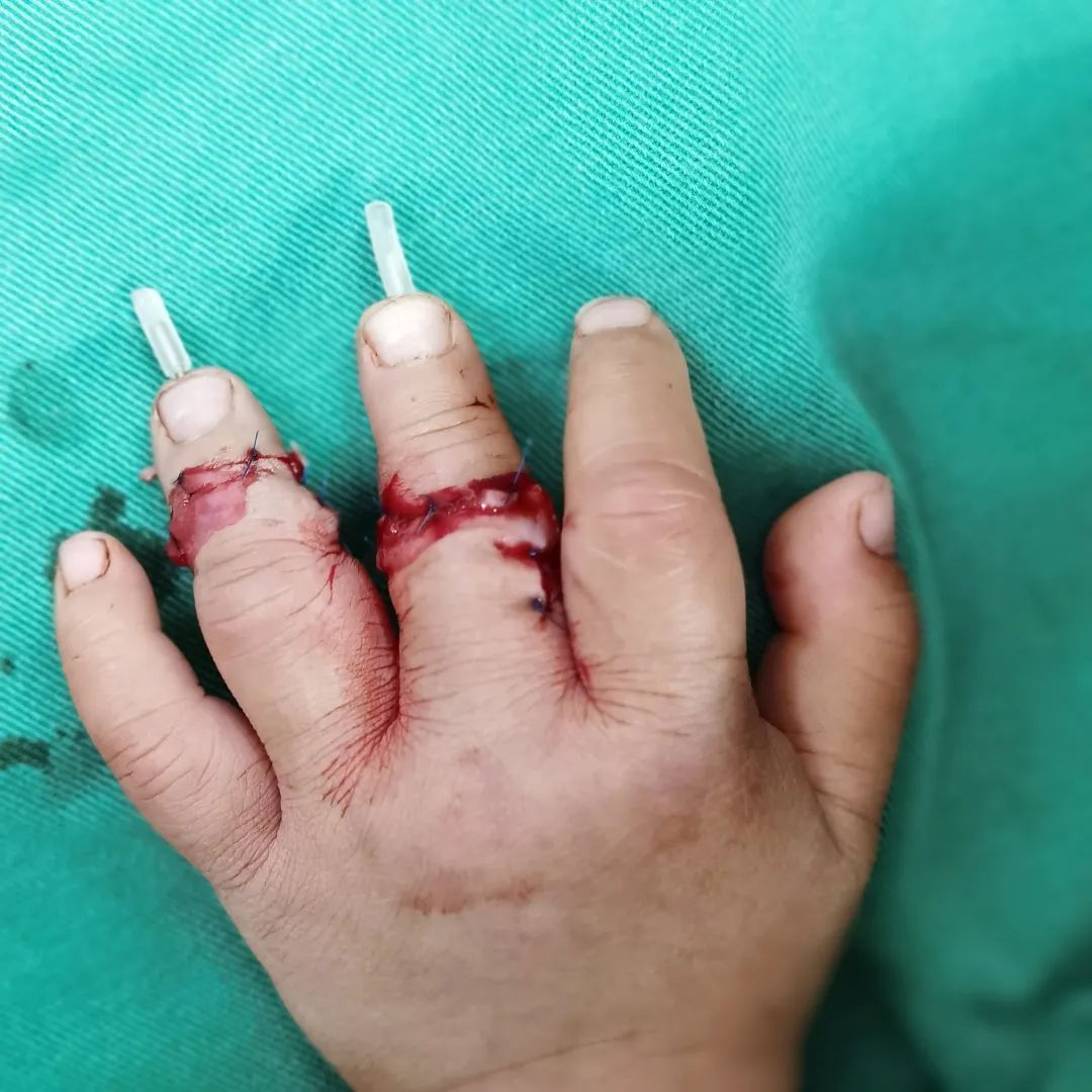 为了争取在伤后最佳救治时间6-8小时内进行手术,创伤手外科团队以最快速度完善术前准备,球球被顺利送入手术室进行手指再植手术。术中显微手外科团队密切配合,在显微镜下熟练地探查神经、血管并做好标记,随后有条不紊在进行清创、固定、缝合。历经5个小时的奋力协作,球球离断的中、环指顺利完成再植,重新恢复了红润。