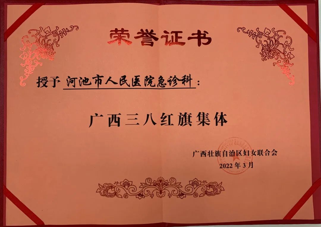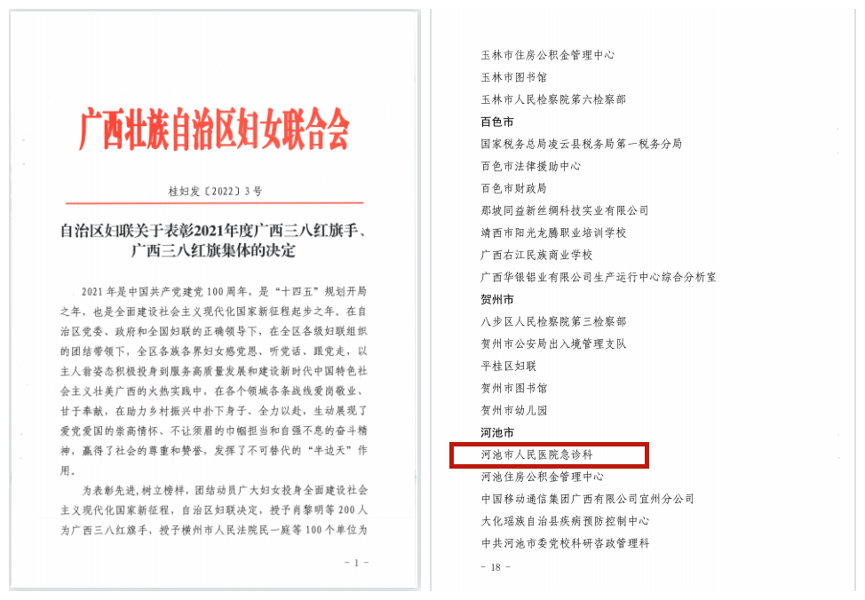 近日,在广西壮族自治区妇联发布《关于表彰2021年度广西三八红旗手、广西三八红旗集体的决定》中,河池市人民医院急诊科荣获“三八红旗集体”荣誉称号,是河池市卫健系统唯一一家荣获此荣誉的单位!