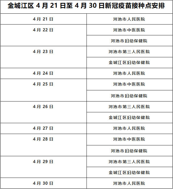 根据河池市金城江区新冠病毒疫苗接种工作专班安排,2022年4月21日至4月30日新冠疫苗接种安排如下,请各位群众根据需求选择新冠疫苗接种点接种。