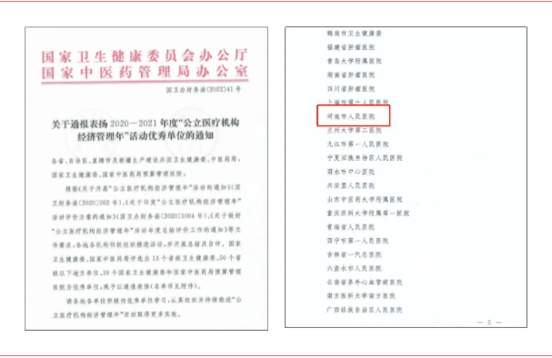 近日,国家卫生健康委、国家中医药管理局印发了《关于通报表扬2020-2021年度“公立医疗机构经济管理年”活动优秀单位的通知》(国卫办财务函〔2022〕41号),通报表扬了13个省级卫生健康委、19个国家卫生健康委和国家中医药局预算管理单位,50个省级以下地方单位,广西仅有两家单位获得表扬。河池市人民医院是全市唯一一家获此殊荣的单位。