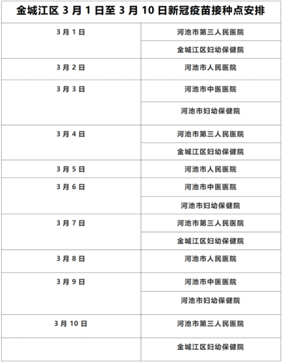 根据河池市金城江区新冠病毒疫苗接种工作专班安排,2022年3月1日至3月10日新冠疫苗接种安排如下,请各位民众根据需求选择新冠疫苗接种点接种。