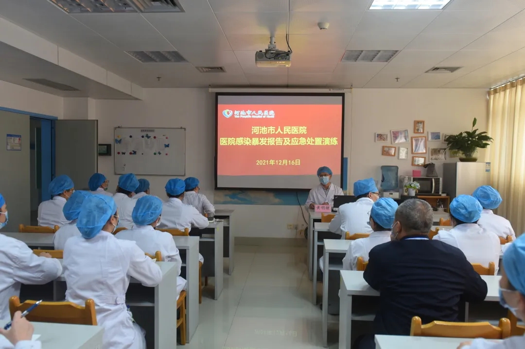12月16日下午,河池市人民医院开展医院感染暴发模拟应急演练。在分管副院长黄明棣的主持和指挥下,由院感科牵头,院内感染管理相关的行政部门负责人、重点临床科室科主任或护士长等50余人共同参与并观摩了演练。