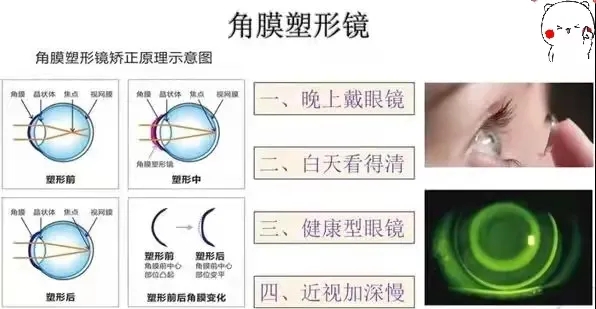 角膜塑形镜又称OK镜,起源于美国,历经50年的发展,已在全球34个国家得到应用,它是一种特殊逆几何形态设计的角膜塑形镜片,其内表面由多个弧段组成。镜片与泪液层分布不均,由此产生的流体力学效应改变角膜几何形态,在睡觉时戴在角膜前部,逐步使角膜弯曲度变平、眼轴缩短,从而有效地预防了近视的快速发展,被誉为“睡觉就能控制近视的技术”。
