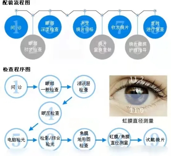 包括眼部健康检查、视力测量、眼压测量、眼轴测量、眼底检查、泪液检查、眼位检查、眼部各项参数测量及综合验光仪检查,排除禁忌症。