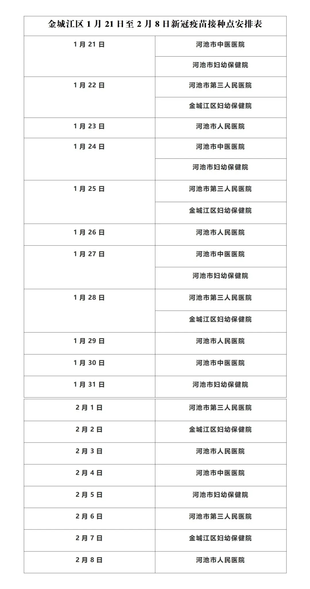 根据河池市金城江区新冠病毒疫苗接种工作专班安排,2022年1月21日至2月8日新冠疫苗接种安排如下,请各位民众根据需求选择新冠疫苗接种点接种。