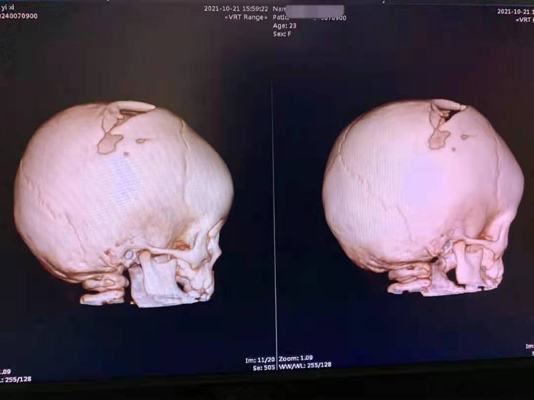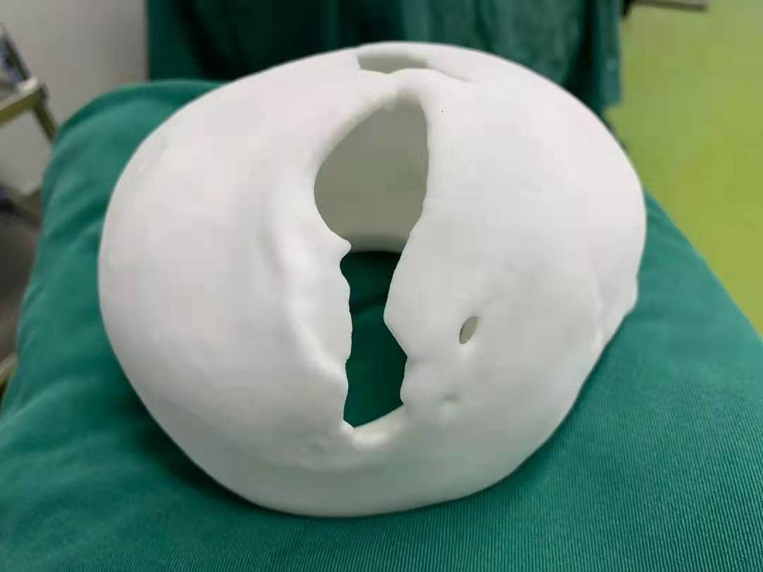 据了解,一年前,患儿小溪(化名)因外伤致颅内血肿、颅骨骨折,经治疗痊愈出院,但因颅骨生长原因,导致局部颅骨缺损,脑组织失去了一块保护罩。11月10日,小溪来到河池市人民医院神经外科就诊,神经外科罗铸主任详细询问其病情,经过科学的诊断,进行薄层CT扫描,发现小溪的右侧额顶部颅骨缺损、脑膜膨出,手术指征明确。罗铸主任立即采集小溪的头颅数据,进行三维重建设计,应用3D打印技术制作出个性化、精准适应患儿缺损骨窗的聚醚醚酮PEEK修补板。