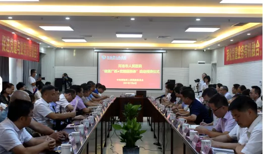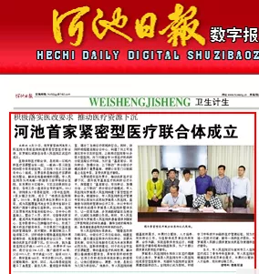 紧密型医联体。近年来,医院立足河池,面向桂西北及黔东南等周边区域,在加强内涵建设的同时,充分发挥地区医疗龙头作用,主动作为,优化医疗资源配置,强力推进医联体建设,并取得显著成效。与凤山、南丹、天峨、都安、东兰等县医院、卫生院以及荔波县人民医院9家医疗单位建立三二或三二一紧密型医联体,与河池市疾控中心组建医疗与卫生防疫结合的紧密型医共体,并邀请国内外知名专家团队,按照国际标准组建了覆盖河池全市及周边地区的康复、肿瘤两个专科联盟,构建了胸痛、脑卒中2个覆盖全市的专科紧急救治网络。
