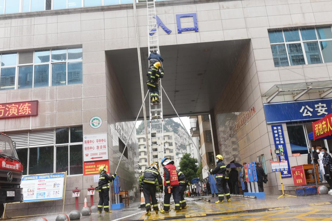 为进一步加强全院职工消防安全意识,掌握对突发火灾的应变、逃生技能,10月29日,河池市人民医院联合河池市金城江区消防救援大队在门诊综合楼开展以“人人参与消防,共创平安和谐”为主题的消防演练。院领导及科室负责人参加观摩指导。