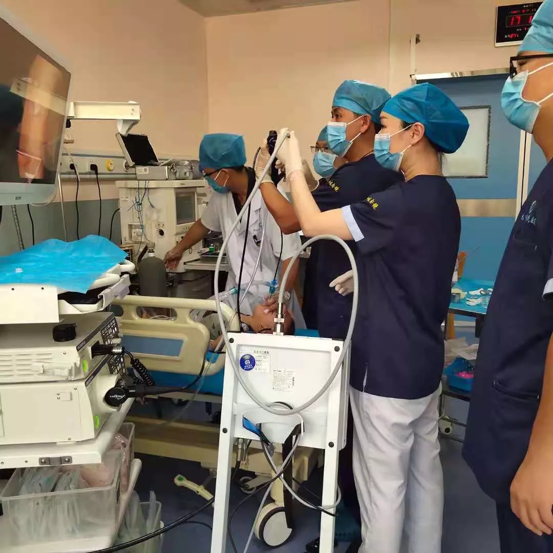 据悉,啵啵(化名)在家中一边吃玉米一边与姐姐打闹,突然出现呛咳、面色紫绀,家属立即送至当地医院就诊,当地医院缺乏医疗设备,立即转送至河池市人民医院救治。急诊行CT检查提示“右主支气管异物并右肺气肿”,急诊科立即将患儿送至儿内科住院治疗,当班医师接诊患儿后立即请示韦瑞含副主任,韦瑞含副主任认为患儿年龄小,气管较狭窄,需与内镜中心协作取出异物。儿内科立即联系呼吸与危重症医学科韦庆主任,韦庆主任了解病情后,指出患儿异物堵塞气管严重,已出现肺气肿,需尽快将异物取出,当即拟定手术方案,决定为患儿行支气管镜下异物取出术。