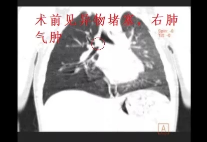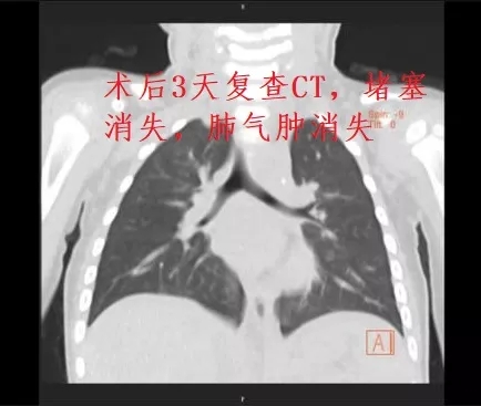 完善术前准备后,医护人员立即送患儿至内镜中心行手术治疗。手术由韦庆主任携科室团队进行,全麻下支气管镜顺利通过口咽部进入主支气管,到达隆突气管分叉处,镜下可见异物已将右主支气管开口处完全堵住,手术历时一小时余,最终将异物分解再通过冷冻探头分次取出,镜下同时见到气管内有较多脓性分泌物,考虑异物堵塞刺激发炎所致。术后继续抗炎治疗,3天后复查胸部CT,可见气道通畅,肺气肿已消失。