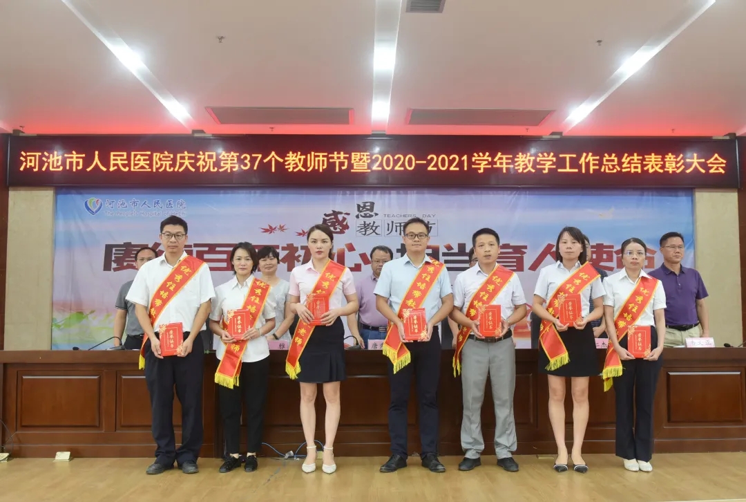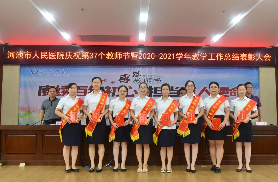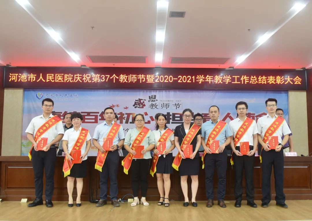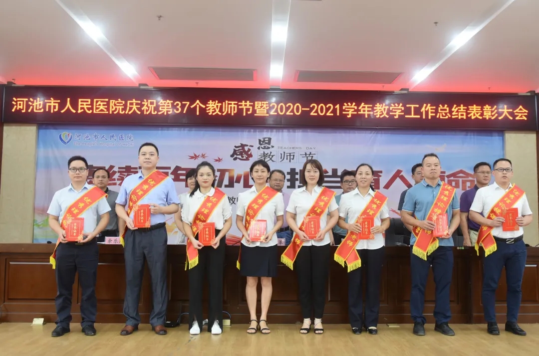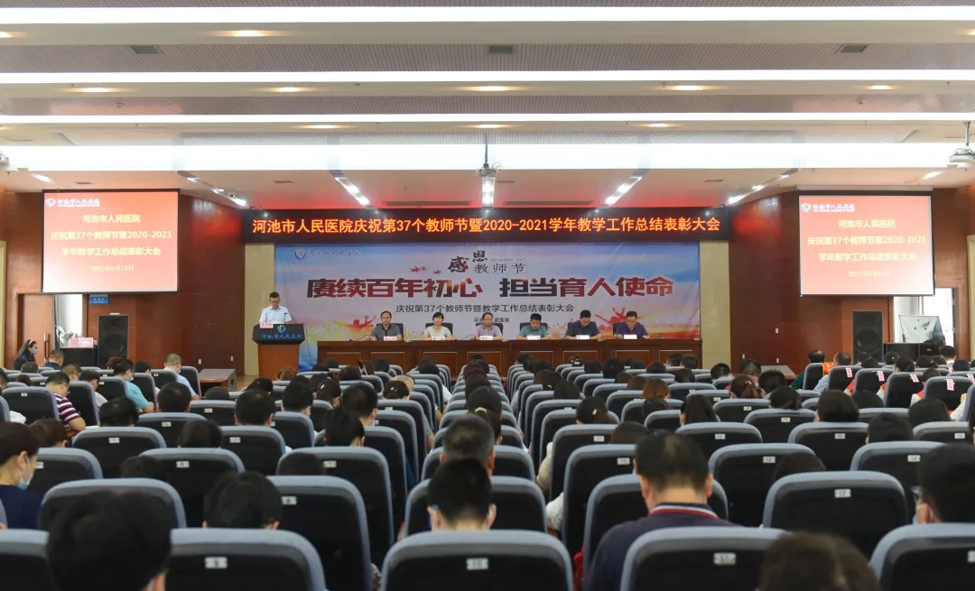 9月13日下午,河池市人民医院隆重召开庆祝第37个教师节暨2020-2021学年教学工作总结表彰大会。院领导班子成员、全院中层干部、教学管理人员、全体理论及见习教师,各院校实习生代表等400余人参加会议。大会由韦仁杰副院长主持。