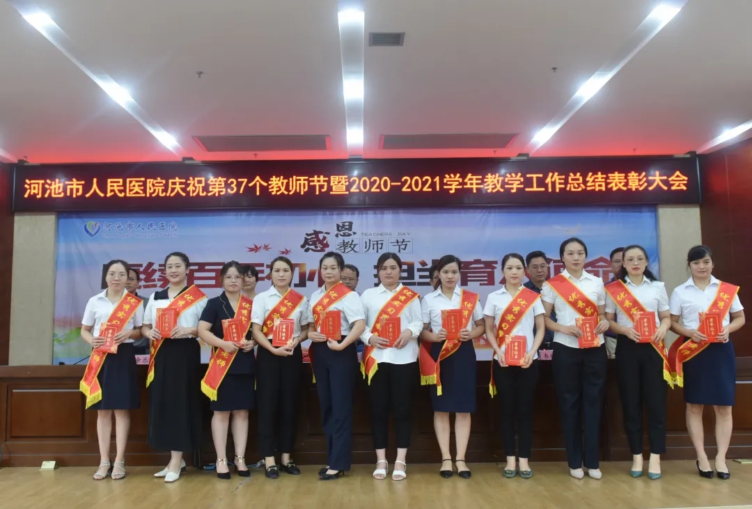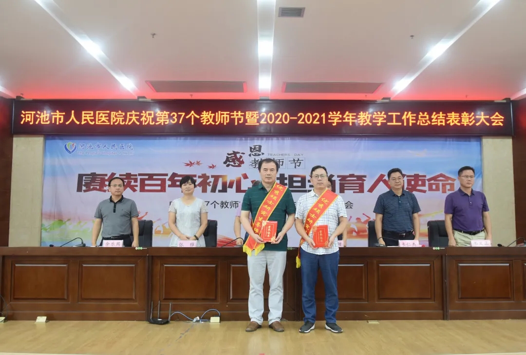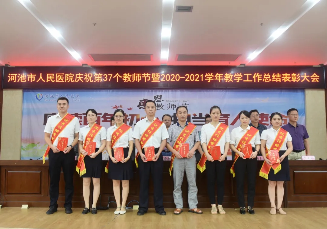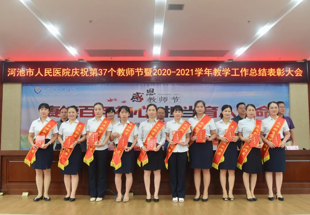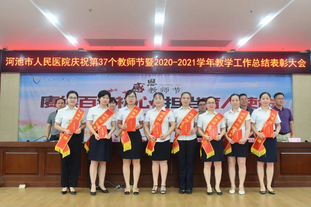 9月13日下午,河池市人民医院隆重召开庆祝第37个教师节暨2020-2021学年教学工作总结表彰大会。院领导班子成员、全院中层干部、教学管理人员、全体理论及见习教师,各院校实习生代表等400余人参加会议。大会由韦仁杰副院长主持。
