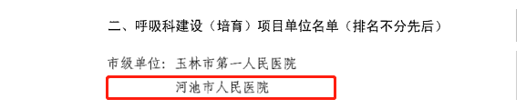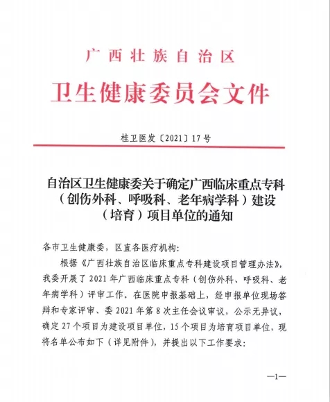 2021年7月16日,在自治区卫生健康委下发《自治区卫生健康委关于确定广西临床重点专科(创伤外科、呼吸科、老年病学科)建设(培育)项目单位的通知》中,我院呼吸与危重症医学科经过单位现场答辩和专家评审、委2021年第8次主任会议审议等严格评审后,获评为广西临床重点专科建设培育项目。此次获评,为我院实现高质量发展提供了新的动力。