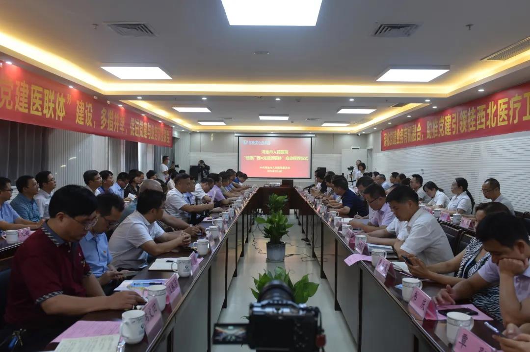 为促进医疗单位党建质量和医疗技术互促双赢,充分发挥医联体引领辐射带动作用,拓宽公立医院党建工作内涵,2021年7月6日下午,我院“健康广西·党建医联体”启动授牌仪式在教学综合楼5楼多功能教室隆重举行,与全市11个县(区)及贵州省荔波县人民医院共计29家医院组成“党建医联体”。市卫生健康委党组书记、主任韦东禄出席会议并作讲话。党建医联体成员单位主要负责人,市人民医院党政领导班子,市人民医院各党支部书记、相关科室负责人共90余人参加启动授牌仪式。仪式由我院党委副书记、院长唐秀革主持。