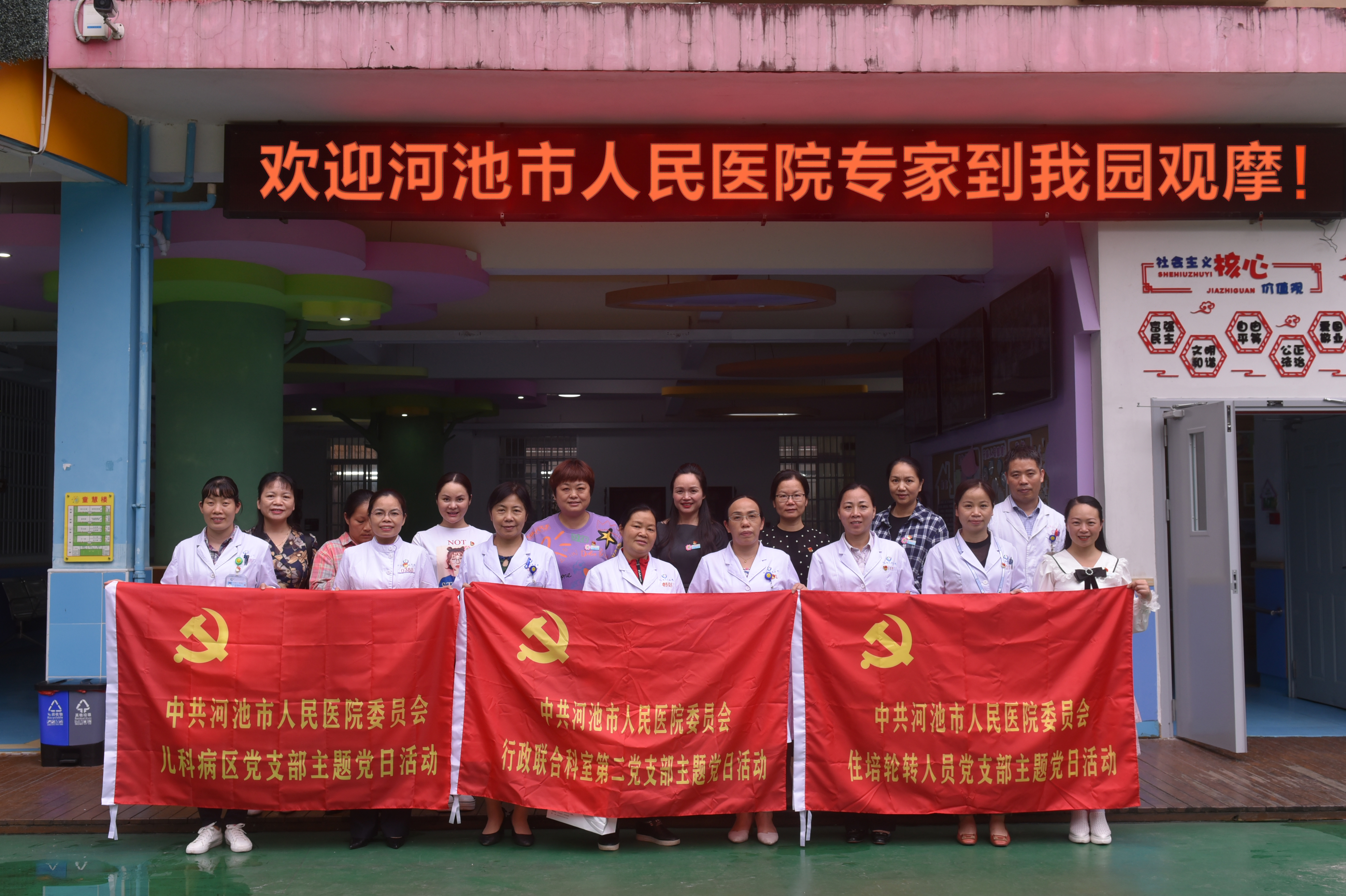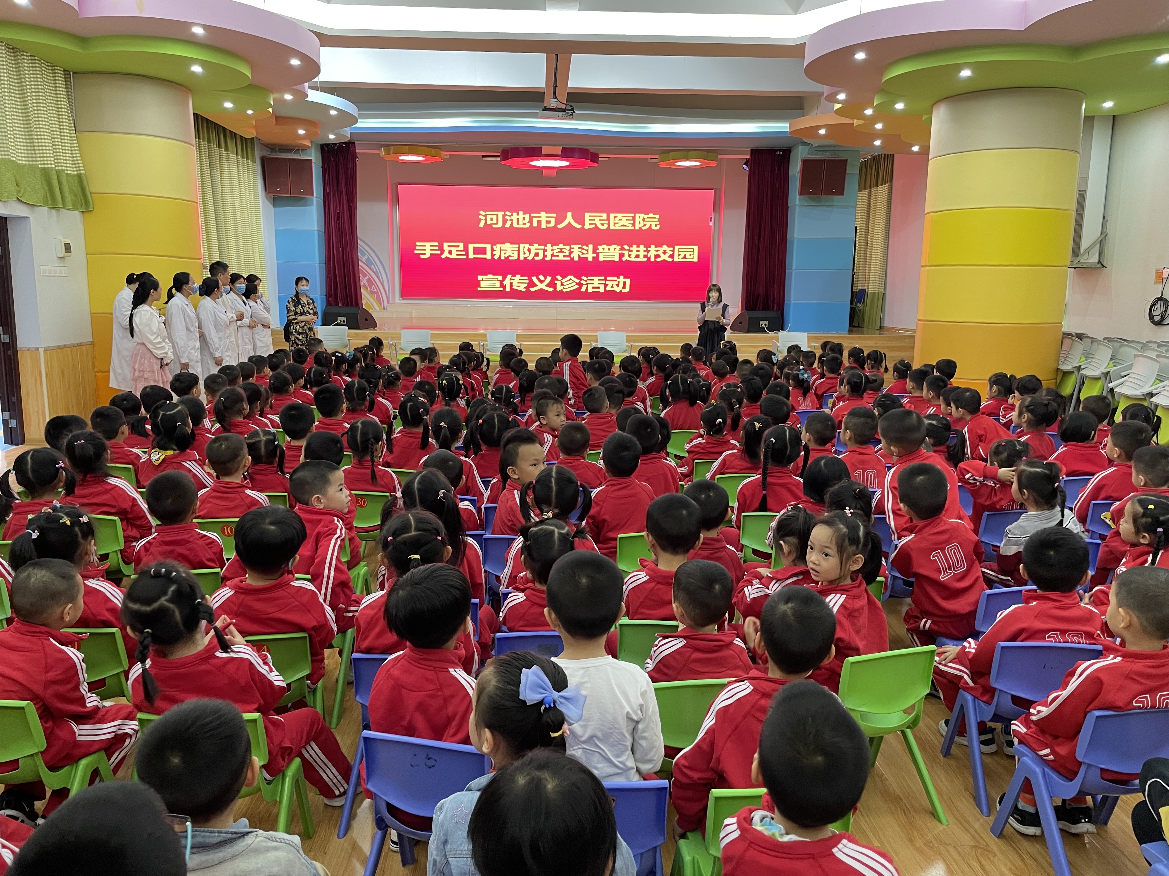 近期,金城江区手足口病疫情上升迅猛,为切实做好孩子们的疾病防控工作,帮助孩子们健康成长,5月20日,我院行政联合科室第二党支部、住培轮转人员党支部、儿科病区党支部组织10名医护志愿者到河池市市直机关幼儿园开展手足口病防控科普进校园宣传义诊主题党日活动。