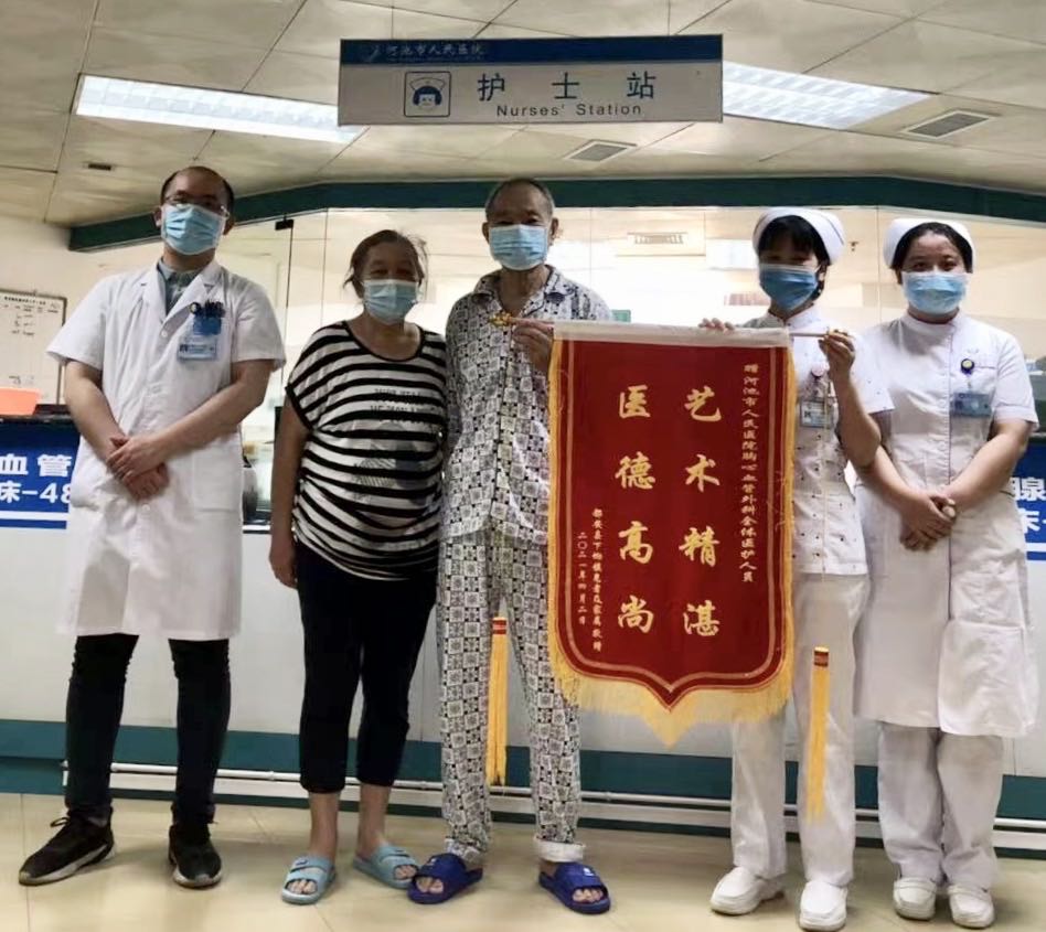 据悉,假性动脉瘤产生的原因包括外伤、感染、遗传因素、退行性变、免疫因素等。经过科室医疗团队集中讨论后,决定为梁先生行腹主动脉瘤腔内隔绝术。在进行充分的术前准备后,胸心血管外科韦正堂副主任、梁旭睿副主任医师、黄智主治医师为患者实施手术,术中约用一个半小时,成功为患者植入国产一体化支架。患者术后恢复好,出院前表达了对医务人员的感谢,特地送来了一面锦旗。