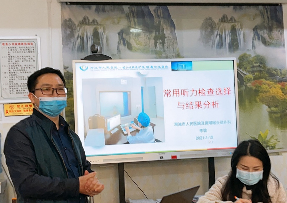 我院耳鼻咽喉科主任李健为环江县人民医院五官科医护人员进行听力相关知识培训