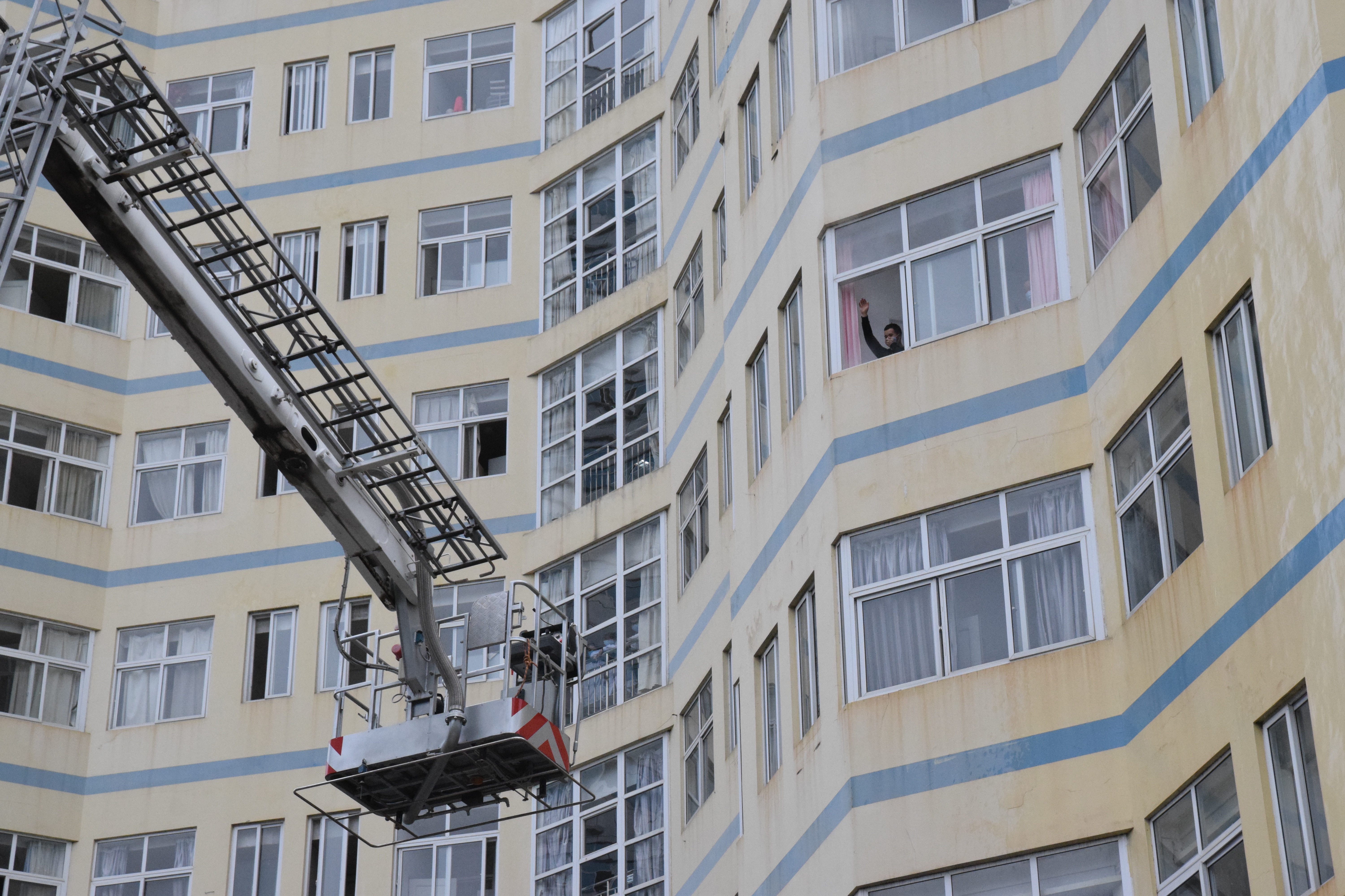 消防队员使用云梯解救被困人员