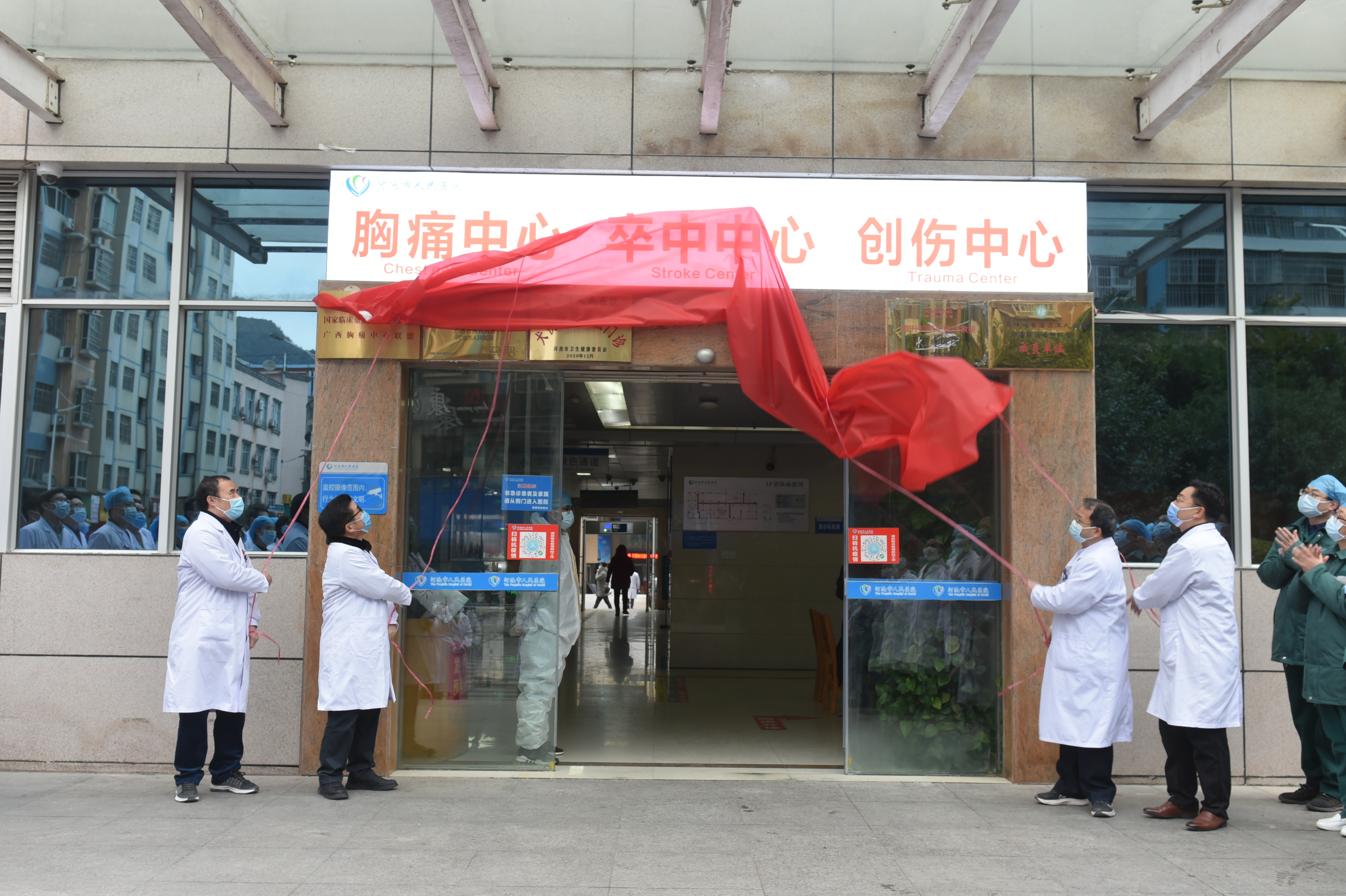 随后,在大家见证下,院长唐秀革、党委书记韦义甜、副院长韦仁杰、胸心血管外科主任覃洪斌共同为创伤中心揭牌。