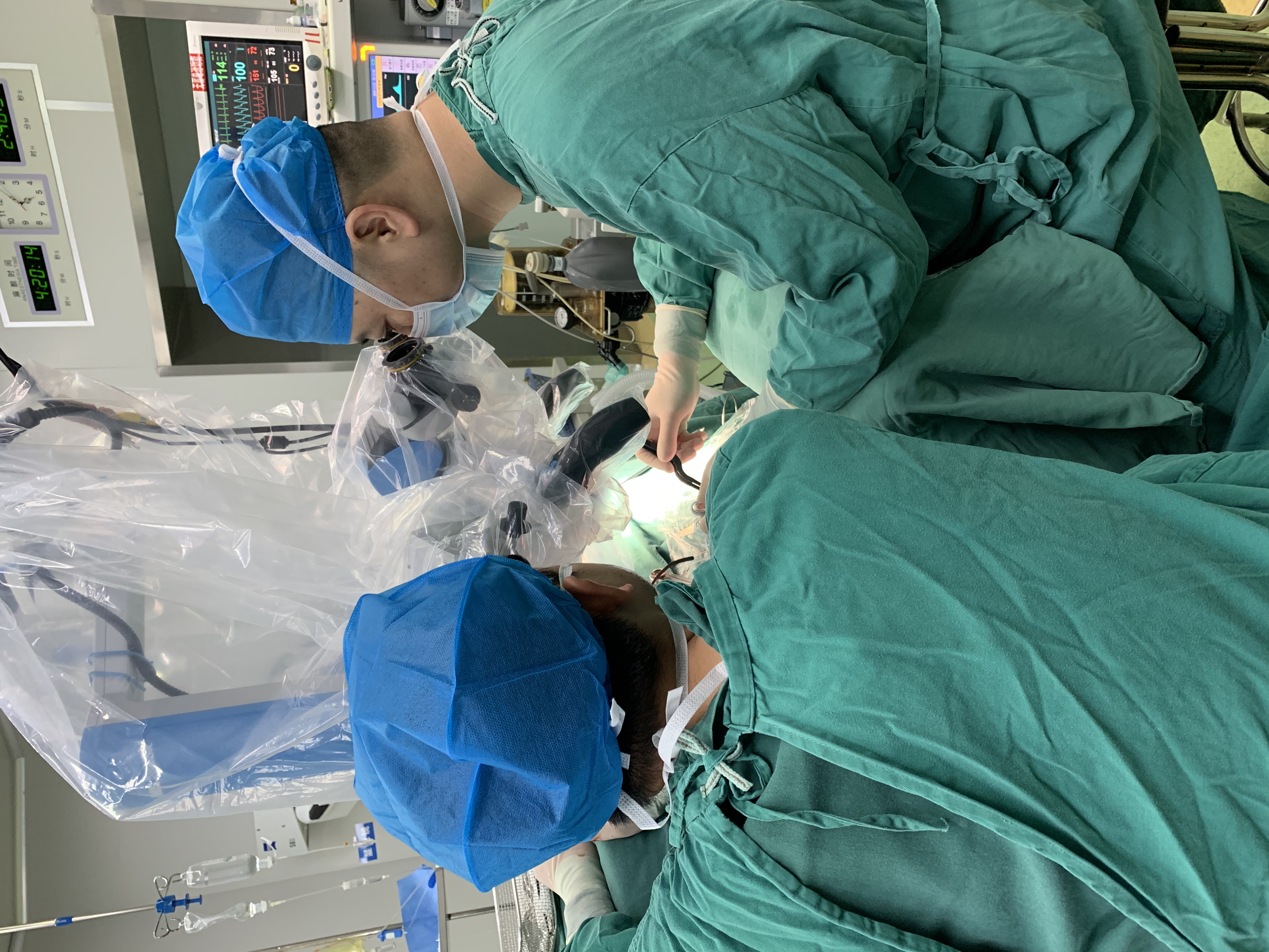 神经外科罗铸主任、李科良主管医师为患者实施脑干出血显微手术