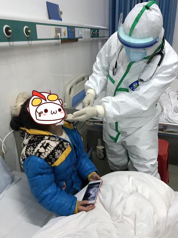 梁丽花为疑似新冠患者检查口腔情况