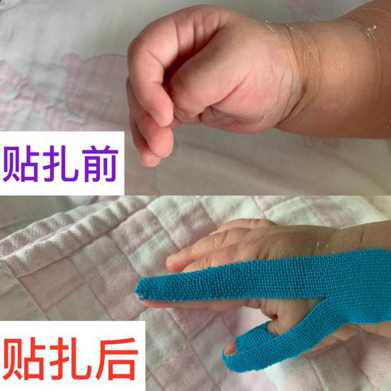 针对这些问题,康复治疗师给予了运动、作业及感统等康复训练之外,还将KT应用于患儿手部,通过拉力将异常的前臂及拇指姿势控制并维持在正确的位置上,长时间持续的牵拉力在一定程度上缓解痉挛,降低肌张力,同时给予患儿一定的感觉刺激,强化手部触觉和深感觉的刺激,有效提高了患儿的康复效果。