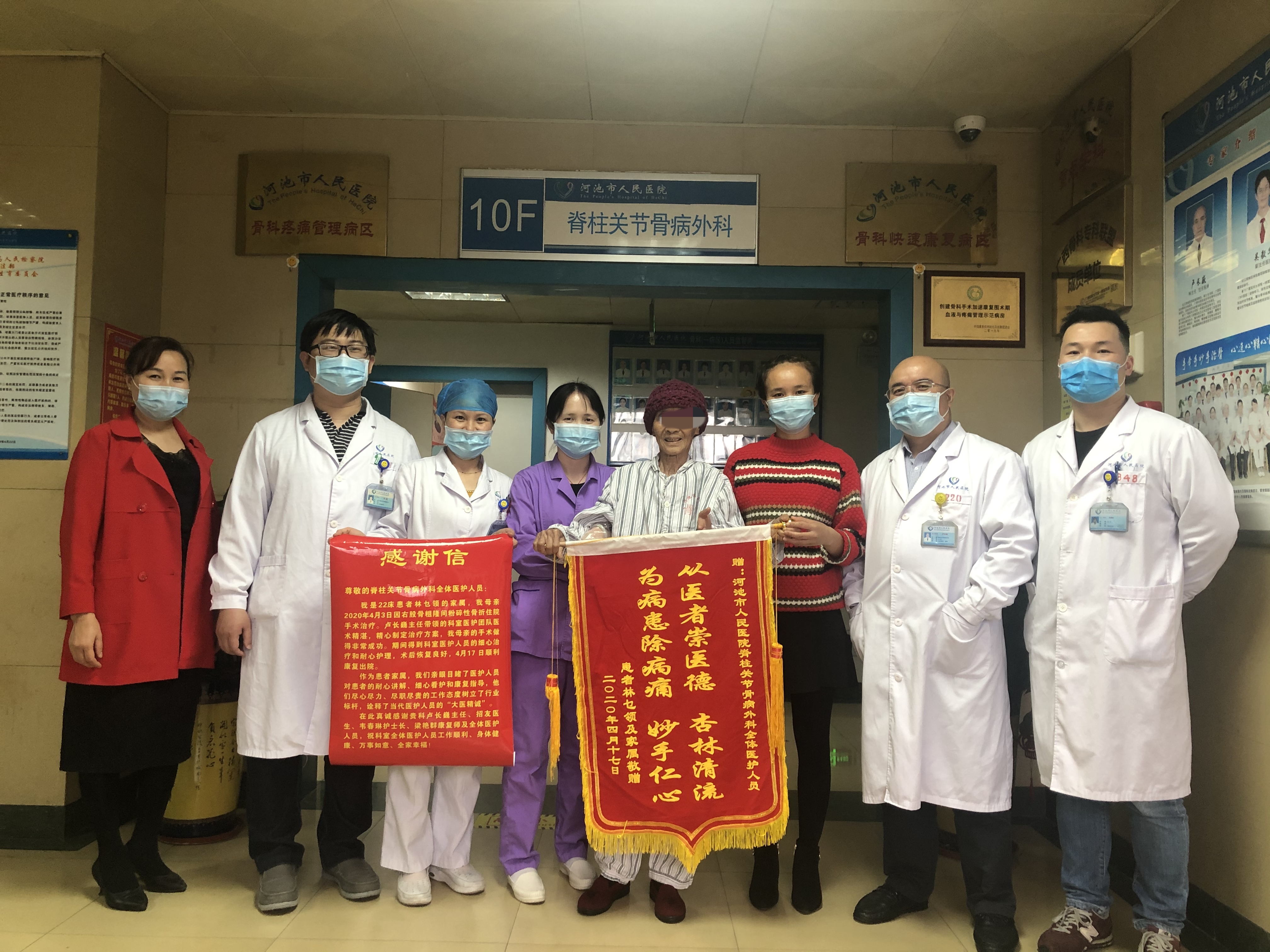 出院时,林阿婆家属送来了感谢信和锦旗。家属说,十分感谢脊柱关节骨病外科和康复医学科医疗团队细心的照顾和耐心的康复指导,让林阿婆成功康复。在与医护团队的合影时,林阿婆露出开心的笑容。