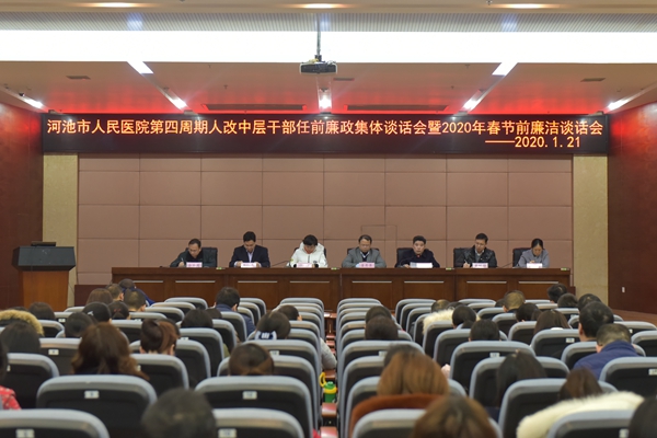 为贯彻落实全面从严治党主体责任,持之以恒落实中央八项规定精神,营造风清气正的节日氛围,1月21日,院党委组织院领导班子成员、医院第四周期人事制度改革拟任的中层干部在门诊综合楼23楼多功能厅召开第四周期人改中层干部任前廉政集体谈话会暨2020年春节前廉洁谈话会。