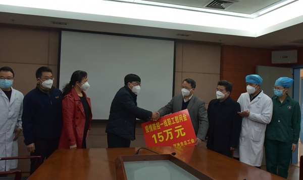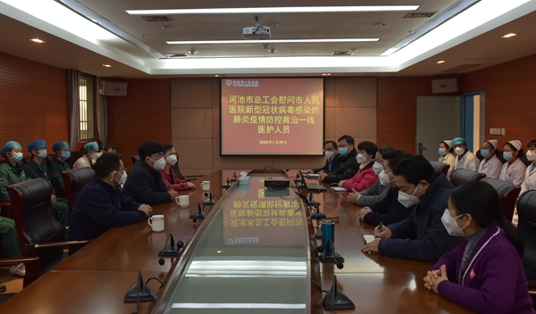 1月29日下午,河池市人大常委会副主任、市总工会主席吴家权,河池市总工会党组书记田景兰,河池市总工会副主席冉景峰一行到河池市人民医院,向春节期间奋战在新型冠状病毒感染的肺炎疫情防控救治一线的医护工作者及相关人员表示亲切慰问,并送予15万慰问金。唐秀革院长、韦义甜书记等院班子及部分重点科室代表参加现场慰问。