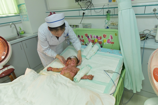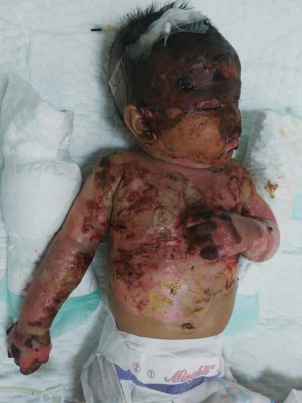 12月3日晚,贵州省三都县周覃镇的一个村庄里,赫爷爷正在给小赫赫准备洗澡水,刚把滚烫的热水倒进浴盆,还没来得及加冷水,小赫赫就扑进了热水里,导致头面颈、躯干、双上肢等多处烫伤。被烫伤的小赫赫由于身体疼痛而哭闹不止,慌乱中的家长来不及多思考,立即将小赫赫送至荔波县人民医院急诊科。由于烫伤面积大,情况严重,当地医院建议转上一级医院治疗,得到小赫赫父母的同意后,当地医院立即与我院联系,将小赫赫送至该院进一步治疗。