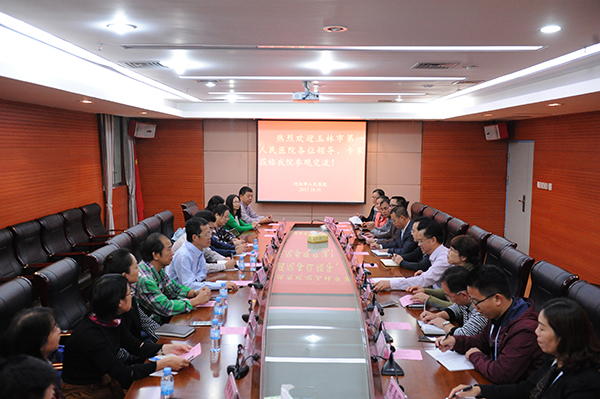 10月19日下午,玉林市第一人民医院院长刘明、副书记陈少何、副院长罗云平、院长助理黄业祺带领院办、财务、人事、医务、护理、信息、产科、泌外等部门负责人到我院参观交流。我院院长梁涛、副院长杨立倩及相关科室负责人出席交流座谈会并陪同参观。