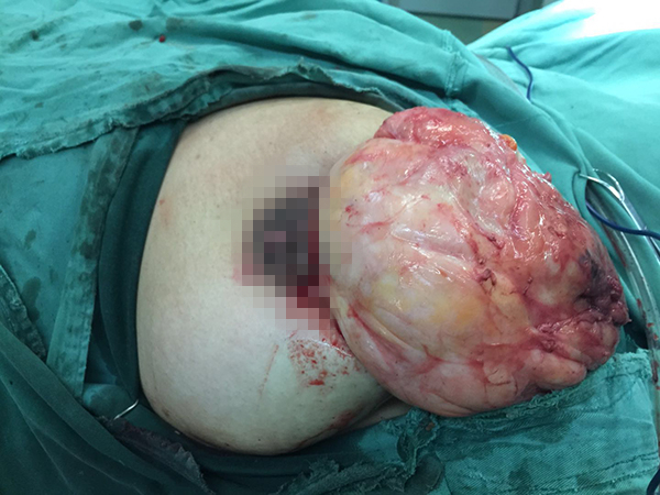 于10月25日,在覃洪斌主任指导下,徐阳春主治医师为患者实施左侧乳腺巨大肿物切除手术,手术切口取左侧乳晕旁行一弧形切口约4.0cm,依次切开皮肤,皮下组织,分离皮瓣至肿物边缘,积极止血,避开重要血管和神经的损伤,慢慢分离,直分离至肿物基底部,将巨大肿物完整地从乳晕切口处脱出,整个手术过程历时约1小时,手术非常成功。手术切口隐蔽,术后几乎难以寻及,从而达到了美容的良好效果。