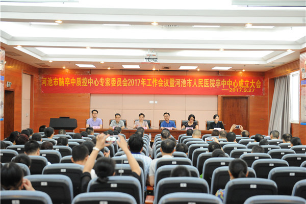 9月27日下午, 河池市脑卒中医疗质量控制中心专家委员会2017年工作会议暨市人民医院卒中中心成立大会在我院举行,市卫计委副主任欧乃坚,市人民医院院长、市脑卒中质控中心专家委员会主任委员梁涛,市四医院院长杨正广、市人民医院副院长蒋军松出席会议,南方医科大学南方医院姬仲博士、深圳市第二人民医院钟旗博士以及全市各医疗机构从事脑卒中防治工作的专家受邀参会。此次大会的召开标志着河池首个规范、高效的脑卒中绿色通道正式启动。