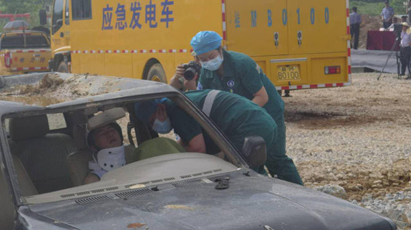 按照工作预案,演练开始,我院急诊科医务人员接到救援任务后,带上充足的急救药品,一路向大化出发。到达现场后,急诊救援人员立即投入救援工作,从了解现场情况、明确救援任务、商讨救援方案、到实施救援行动,一切都在紧锣密鼓地进行着。最后,根据先重后轻、现场抢救的原则,首先对伤员伤情进行初步判断,然后实施现场处置,伤检分类,迅速有序地处理伤员,最后将伤员搬运上救护车运送到附近医院进一步救治。