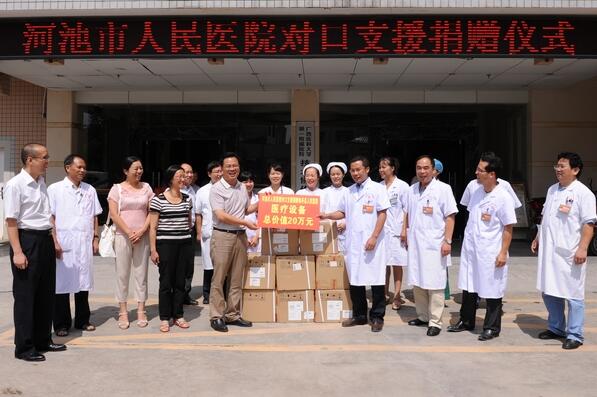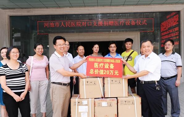 近日,作为南丹县、天峨县人民医院对口帮扶单位,我院再次向帮扶单位伸出援助之手,为两县人民医院捐赠了价值40万元的医疗设备,我院院长梁涛、副院长蒋军松以及部分中层干部参加对口支援捐赠仪式。