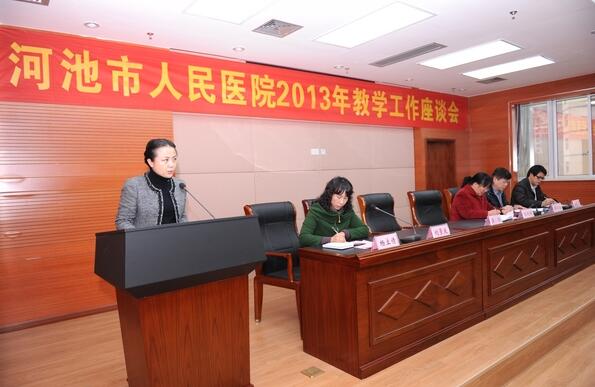 1月21日下午, 2013年教学工作座谈会在门诊楼5楼学术报告厅隆重举行,党委书记陆艳姣、副院长谭俊扬、党委副书记杨立倩以及右江民族医学院临床学院学生科科长廖赞勇出席座谈会,我院教师代表、各医学院校实习小组组长及右江民族医学院09级临床本科班的全体同学共80余人参加座谈会,会议由杨立倩副书记主持。