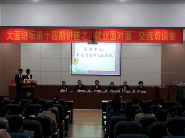 12月8日,在梁涛院长的带领下,我院一行7人来到右江民族医学院2013年以毕业生“就业面对面”为主题的大医讲堂。早上8点半,讲堂早就已经座无虚席,400多名临床、护理、助产、检验、影像、药学等专业的毕业生早早地来到讲堂,期待着面对面就业交流。讲堂间,梁涛院长将河池市人民医院的基本情况、人才培养、学科建设、业务开展情况以及未来发展目标等向同学们作了详细的介绍,他的精彩演讲博得了同学们一阵阵热烈的掌声。然后主持人就同学们关心的几个问题进行了提问,梁涛院长简要明了而又生动活泼的解答让现场气氛轻松活跃,缓解了同学们的紧张情绪。接下来的现场互动环节,现场气氛更是活跃。同学们纷纷踊跃举手提问,而梁涛院长也一一为同学们耐心解答了我院的发展前景、用人要求、薪酬福利等问题。最后由蒋军松副院长在祝福语录册上写下了对《大医讲堂》的祝福语,表示我院对《大医讲堂》的美好祝愿。