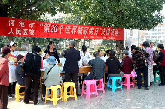 11月14日是第20个世界糖尿病日,我院中医内科组织了16名医护人员,在韦雄主任的带领下到市文化广场开展以“糖尿病教育与预防”为主题,口号为“控制糖尿病,刻不容缓”的糖尿病义诊和宣传活动。义诊当天共接待群众微量血糖检查412人,糖尿病咨询1200人,测血压660人,发放糖尿病宣传资料达2000多份,向群众宣传糖尿病的预防、诊断、治疗方法,帮助糖尿病患者正确掌握糖尿病相关知识,做到早发现早治疗,降低糖尿病并发症发生机率,提高生活质量。
