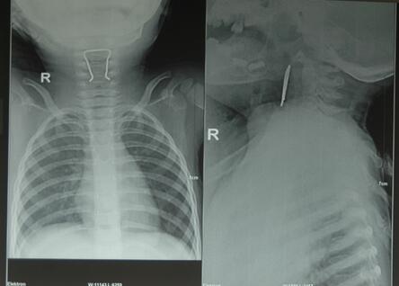 2月4日上午12点08分河池市保平乡一位1岁6个月的患儿误吞金属异物后,吞咽困难2小时,生命垂危,被父母送进我院耳鼻喉科门诊急救。经检查口咽部未见异物,急送放射科进行胸正侧位照片,发现食道入口处可见“U”型金属异物,诊断为食道异物。当时已超过下班时间十多分钟,时间就是生命,耳鼻喉科主任、主治医师韦善文急病人之所急、想病人之所想,与放射科主治医师胡琪琳配合在无麻醉下,不到2分钟时间采用异物钳把金属异物取出。
