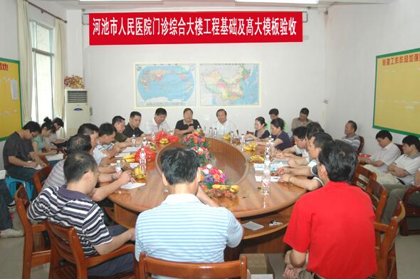 作为河池市2009年重大建设项目之一的河池市人民医院门诊综合大楼工程自2009年4月立项以来,由于规划有序、管理有方,施工速度均领先于同期的工程项目。据了解,从2009年4月至12月,该工程就以快捷的速度完成“连跳”:2009年4月2日,项目被列入2009年河池市重大建设项目之一,仅半个月,项目即完成立项手续;同月,完成项目环评报告并批复;5月,完成项目可研报告并批复;6月,完成旧门诊楼拆除的请示并批复;7月,完成工程总平面规划和工程建筑设计方案并批复及开工前准备工作;8月,完成临时工程规划许可证及工程开工报建手续并批复;10月,完成工程施工单位及监理单位投招标工作;12月,完成工程施工许可证办理手续及工程项目全程跟踪审计协议。截至目前,已完成大楼基础及进行第4层的主体框架的施工,施工进展又好又快。2010年6月3日经河池市质量监督站、深圳市华蓝设计有限公司、桂林华厦建设监理有限责任公司、广西建工集团第五建筑工程有限责任公司、建材桂林地质工程勘察院等专家对工程正负零以下基础及门诊大厅高大模板进行验收,验收合格。